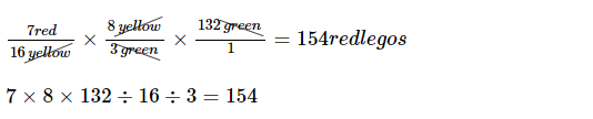 Dimensional analysis is a great way to approach this problem because we are comparing multiple things (yellow, red, and green legos). To start dimensional analysis, create a fraction with what you are looking for at the top of the first fraction. We are trying to find RED legos so we will start off our problem with red legos at the top. We are told there are 16 yellow legos for every 7 red legos. Let's use that. Look at the first fraction below to see how it is written (7 red at the top and 16 yellow at the bottom). We will then put the yellow legos at the top of the next fraction, which will allow us to cancel out the yellow words. For that fraction, we will have 8 yellow legos at the top and 3 green legos at the bottom. Notice that is also given in the problem. Finally, to get rid of the green word at the bottom, we need to multiply by one additional fraction with green at the top. This is where we can put 132 green legos at the top, which represents the one bin of legos. Finally, you can multiply all of the top numbers and divide by all of the bottom numbers to get the answer.