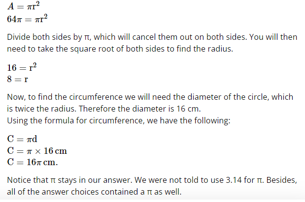 The area of a circle is 64π cm2. What is the circumference of the circle?