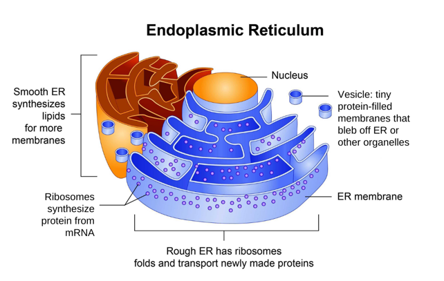 The endoplasmic reticulum “inside the cytoplasm network” was so named because it could be visualized as a maze of folded membranes, usually nestled up close to the nucleus, but sometimes spreading far and away down a neuronal axon. Sometimes these maze-like membranes looked dotted, so those ones were called “rough” ER. Sometimes they weren’t, and those ones got called “smooth” ER. Further research revealed that the rough ER can receive newly made proteins inside of itself, and it works hard to make sure the proteins are folded properly as they pass through the maze-like tunnels of these membranes. This helps transport the protein toward its next destination, which is often the Golgi Bodies (but not always). The smooth ER functions quite differently. They can synthesize (make) lipids such as phospholipids and cholesterol, which are essential for building cell membranes, lipoproteins, cell signaling molecules, and more.