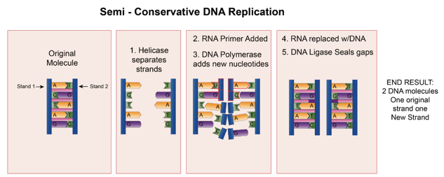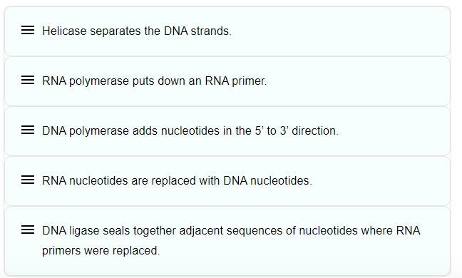 DNA replication can begin when the enzyme helicase breaks the hydrogen bonds holding the double strands together. It then moves along the molecule, popping apart the two strands. Behind it, RNA polymerase now is able to put down an RNA primer. Once that is there, DNA polymerase can start from the primer, and link together the complementary base pairs to build a new double-stranded molecule. Another DNA polymerase comes along and replaces all those RNA nucleotides with DNA. Last DNA ligase seals together the remaining gaps between sections of new nucleotides.