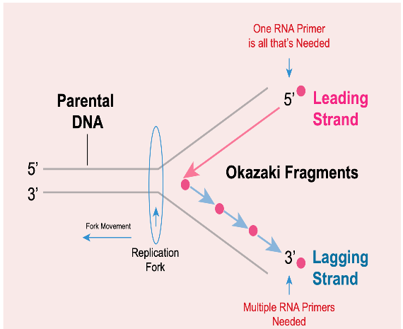 Option C is correct. All DNA must be replicated in the 5’ to 3’ direction. The necessary covalent bonds just can’t chemically be attached in the other direction. The problem, then, is that only one side of the origin of replication can extend away from the initial RNA primer and follow the unwinding DNA strands to keep going all the way to the end of the DNA molecule. The other side of the origin replication will need multiple RNA primers placed between the initial RNA primer and the replication fork that is moving toward the end of the DNA molecule. Once the primers are placed, DNA polymerase can add small chunks of DNA connecting the primers while moving in the 5’ to 3’ direction.