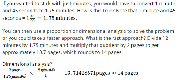 You could also convert 1 minute and 45 seconds to just seconds, which would be 105 seconds. You can then convert 12 minutes to seconds, which is 720 seconds. You could then apply the fast approach mentioned