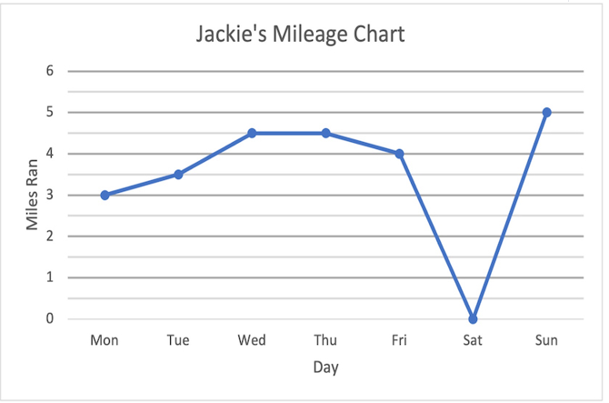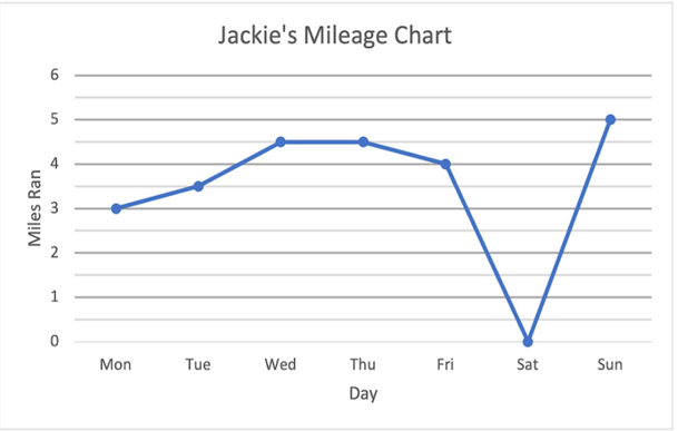 Add up all of the miles that Jackie ran each day and divide by 7 to find the mean. We divide by seven because there are seven days’ worth of data in the chart.
