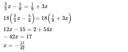 Multiply both sides of the equation by a common denominator. We will use 18 in this example, but any common denominator will work.