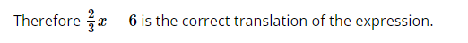 Six less than two-thirds of a number means that 6 needs to be subtracted, not the two-thirds. This is a common misconception. For example, what is six less than twenty? That is 14 right, because 20 - 6 = 14.