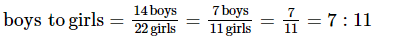 Be careful. The class has 36 students and 22 of them are girls. That means there are 14 boys. Now to find the ratio of boys to girls, you can create a fraction and simplify it. Order is very important.