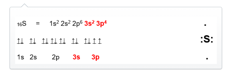From the orbital diagram, there are 2 unpaired electrons in the 3p orbital. Thus, the Lewis structure of S is: